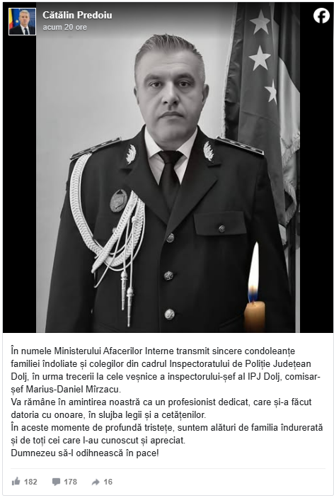 „În numele Ministerul Afacerilor Interne transmit sincere condoleanțe familiei îndoliate și colegilor din cadrul Inspectoratului de Poliție Județean Dolj, în urma trecerii la cele veșnice a inspectorului-șef al IPJ Dolj, comisar-șef Marius-Daniel Mîrzacu.