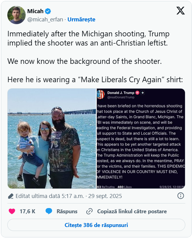 Atacul de la biserica mormonă din Michigan vine la doar câteva ore de la un altul petrecut în Carolina de Nord, unde un bărbat aflat într-o ambarcaţiune a deschis focul asupra clienţilor unei terase aflate la malul mării în oraşul Southport. Trei persoane au fost ucise şi opt rănite, iar atacatorul a fost arestat o jumătate de oră mai târziu.